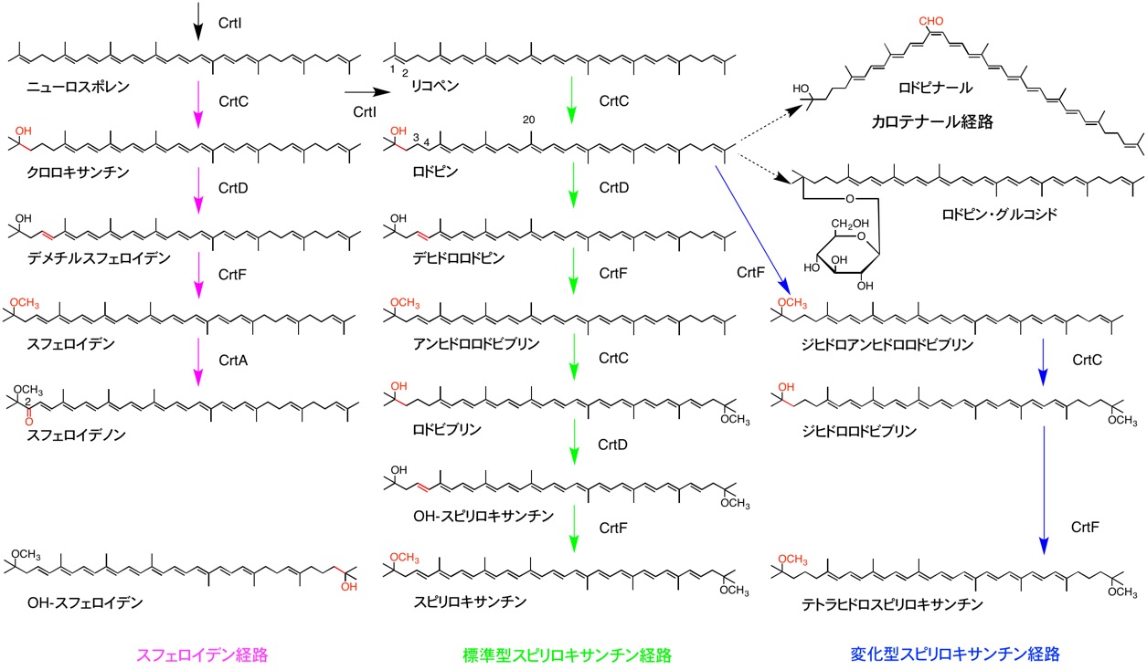 Rhabdochromatiumはリコペンを蓄積するが,CrtCの活性低下によりロドピンを合成できないと考えられる.Phaeospirillum,Thermochromatiumなどはロドピンを蓄積するが,CrtDの低活性化とC-3,4が単結合でCrtFの基質にならないためと考えられる.一方,Rhodospiraなどはテトラヒドロスピリロキサンチンを蓄積するが,この場合はCrtDが欠損しているが,C-3,4が単結合でもCrtFの基質になるため不飽和化(CrtD)を抜かしてメトキシ化(CrtF)が起こると考えられる.C-1水酸基のままであるデメチルスフェロイデンを蓄積するRhodobacaはCrtF活性が低下したためと考えられる.