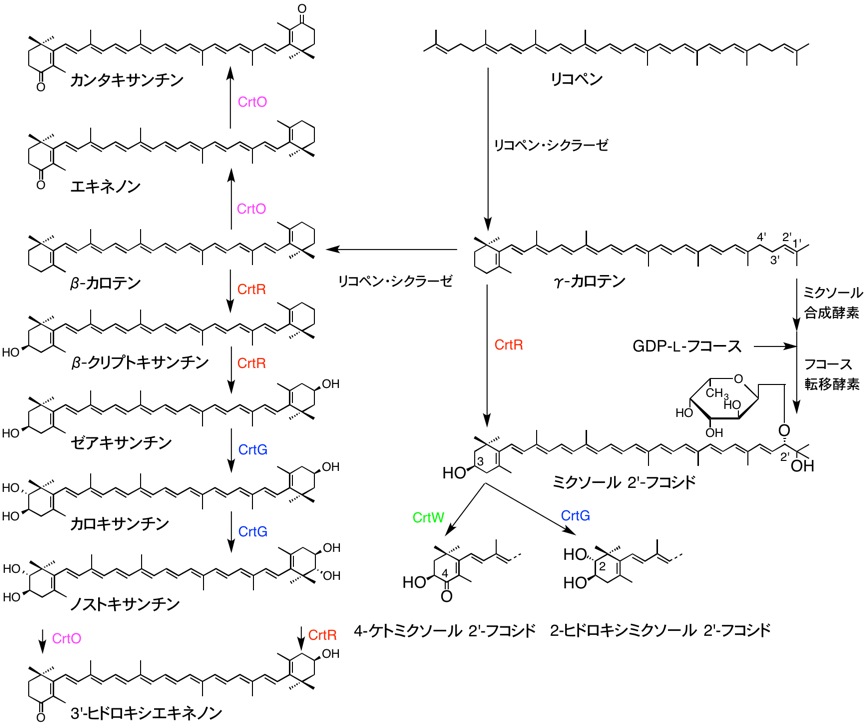 シアノバクテリアは多種多様なカロテノイドを持っているが,いくつかの合成経路に分類でき,種によって持っている合成経路の違いや酵素の基質特異性の違いなどで説明できる.カロテノイドの生合成遺伝子は紅色細菌と異なりクラスターを形成していないため,解明できない部分もある.