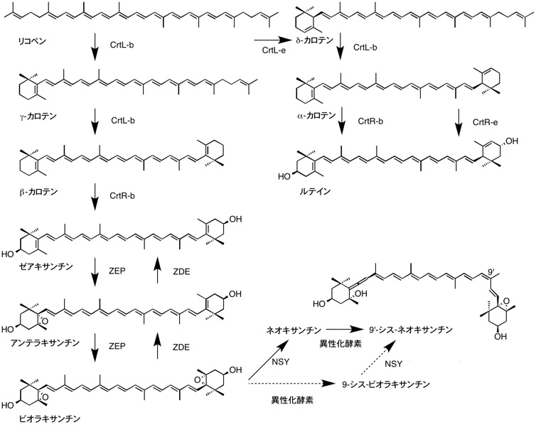 フィトエンの生合成とリコペンの生合成によりリコペンが合成される.リコペンのΨ末端基がリコペンβ-シクラーゼ(CrtL, CrtY)により環化してβ末端基に変わり,γ-カロテンを経てβ-カロテンが合成される.この遺伝子は陸上植物(crtL),シアノバクテリア,好気性光合成細菌(crtY)から単離されて相同性がある.一方,リコベンのΨ末端基をε末端基に変えるリコペンε-シクラーゼ(CrtL-e)は陸上植物からのみ単離されている.リコペンのみ基質になってδ-カロテンが合成されるが,γ-カロテン,δ-カロテンは基質にならない.δ-カロテンは次にCrtL-bによりα-カロテンに変わる.またβ-カロテンはβ-カロテン水酸化酵素(CrtR-b, CrtR)によりゼアキサンチンになる.この遺伝子は陸上植物,シアノバクテリアから単離されている.一方,α-カロテンはCrtR-bとε-カロテン水酸化酵素(CrtR-e)によりルテインになる.ゼアキサンチンはゼアキサンチンエポキシダーゼ(ZEP)によってアンテラキサンチンを経てビオラキサンチンに変わる.強光条件ではビオラキサンチンデエポキシダーゼ(VDE)が逆反応を行い,キサントフィルサイクルはこの2種類の酵素により調節される.最後にビオラキサンチンは9'-シス-ネオキサンチンに変わる.ネオキサンチン合成酵素(NSY)が同定された.また葉緑体のネオキサンチンはすべて9'-シス型であることからシス異性化酵素もあると考えられている.CrtL-b,CrtL-e,NSYは互いに酵素の反応機構が似ており,またアミノ酸配列に相同性がみられる.特に活性中心部分は一部のアミノ酸の置換があるのみである.同一機能をもつ酵素が複数存在する種,葉緑体と色素体で使い分けている種もある.